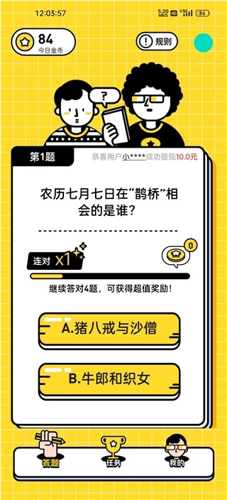 《我答题特牛红包版》,由厦门猫呗信息科技有限公司精心打造,是一款通过答题就能轻松赚取零花钱的宝藏APP。 这款游戏堪称答题爱好者的乐园,为玩家准备了海量且丰富多样的答题类型与内容。题目类型涵盖脑筋急转弯、成语、诗词、歇后语等多个领域;题目内容更是上天入地,无所不包,从生活常识到娱乐八卦,从文学经典到天文地理,应有尽有。在这里,玩家可以尽情施展自己的知识储备。 游戏规则也很简单,用户能够无限答题,每答对一题,即可获得相应的金币奖励;若回答错误,则没有奖励。值得一提的是,连续答对还能触发连对机制,获取更为丰厚的奖励,一旦答错,连对奖励便会清零,所以答题时可要格外谨慎哦。 不仅如此,游戏中的奖励更是丰富多彩。签到有红包,答题也有红包,新用户注册还有新人红包。除此之外,还有诸多福利等待您去探索发掘。 在设计方面,《我答题特牛红包版》的界面简洁明了,仅有三个主界面,操作轻松简单。与此同时,游戏还配备了休闲好听的背景音乐,让您在答题赚钱的过程中,既能放松身心,又能学到海量知识,如此一举多得的好事,何乐而不为呢?赶快下载体验吧!