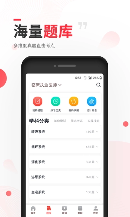 2、多种题库自由练习,能够清楚看到所有的练习结果。