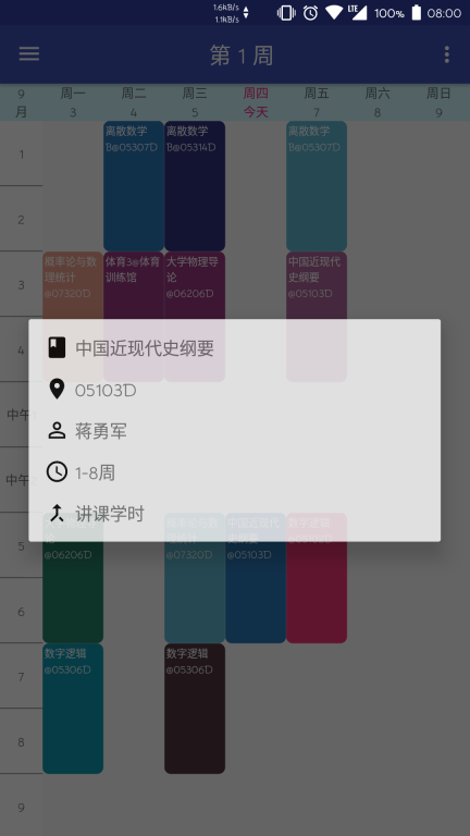 *每一周的课程安排都能够清晰了解,并且还选用不同的颜色显示出了不同类型的课程。