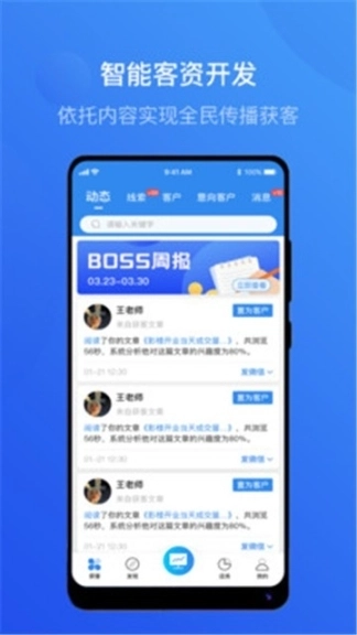 可以一键轻松智能获取精准意向客户,并随时发起沟通交流进行客户关系的维护