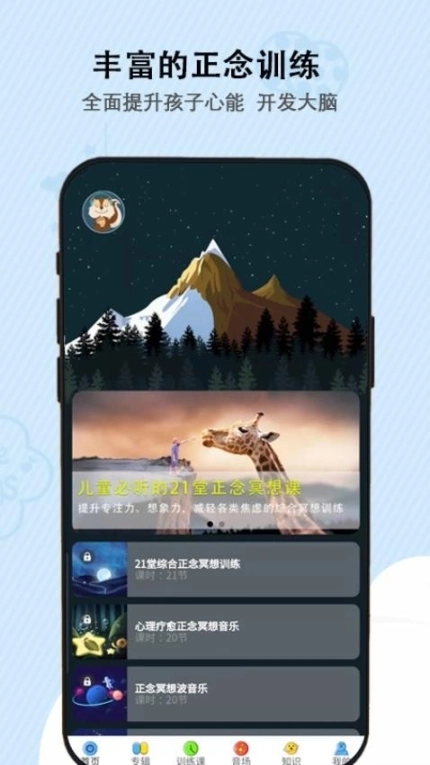 1、【正念训练】:包含21堂综合正念训练、专注力正念训练、学习力正念训练、影像引导式正念训练、情绪管理正念训练、减压正念训练、自信心正念训练、古诗正念训练、感像能力正念训练等,提高孩子专注力、学习力、自信心和情绪管理能力等,后续会持续开发更多正念训练。