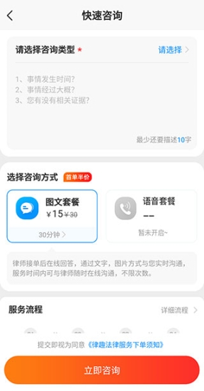3、【快速咨询律师】功能可以让用户在支付一笔小额费用之后,向专业律师提交自己的咨询事件。