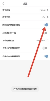 4、进入设置,然后把【运营商网络自动播放】的按钮开启即可。
