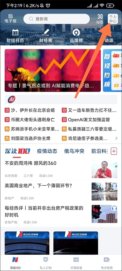 1、首先打开每日经济新闻app,点击主页面左上角的个人中心。