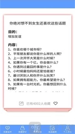 这里有很多不肉麻的情话,一下子就能戳到女神的心,让她对你产生青睐,这款软件是完全免费的,里面没有广告,不会突然弹出来再收取你的费用,所以相当人性化,这个软件还是很实用的,对于一些实在不知道怎么追求人的用户而言,值得尝试。