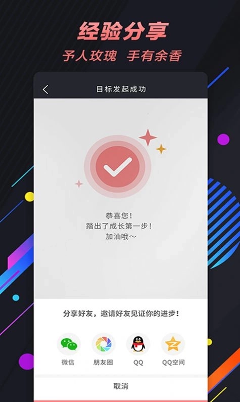 1、签到打卡:目标发起后,每天完成目标并进行签到打卡,可以进行文字图片等形式签到并叙述您的感受;