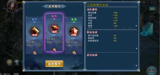 3、属性:根骨影响人物成长,最好随机到满根骨或95以上,其他属性在90+左右最合宜,在四维属性之外,输出主角更偏重暴击、命中、速度等属性,防御主角更注重招架、韧性反震等;
