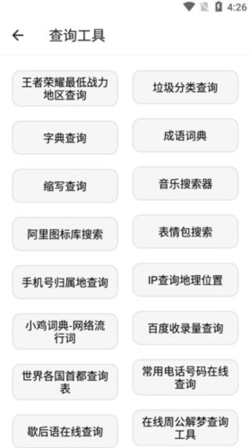 4、点开查询工具,可以查看王者荣耀最低战力地区、垃圾分类、字典查询、成语查询、缩写查询、表情包搜索。