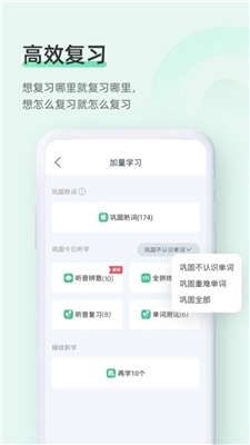 3、提供“词义回想”、“听音复习”、“循环听音”、“锁屏背单词”等功能全方位加强单词记忆。