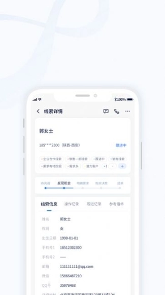 1、清晰完善的客户资料界面,让您将客户详情轻松掌握,历史跟进记录,客户的跟进状态一目了然。