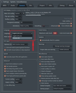 2、这里是调整FL Studio的常规设置的面板,在图中红框框出来的那里选择“Chinese(zh)”