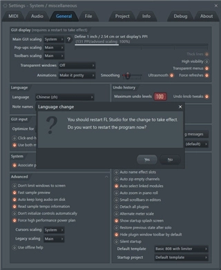 3、随后FL Studio会弹出一个提示,大致意思是FL Studio需要重启以应用刚才的修改,这里我们直接点击“Yes”即可。