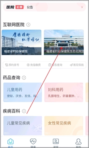 1、进入福建省妇幼保健院app的首页,选择院区。